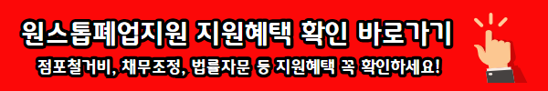 점포 철거비, 사업정리 컨설팅, 폐업 법률 자문, 채무조정 상담·설루션 제공 및 채무조정 소송대리지원의 혜택을 지원하고 있으며, 선착순 마감으로 예산 소진 시 조기 마감되면 혜택을 못 받을 수 있으니, 빠른 신청으로 혜택 꼭 받으세요!